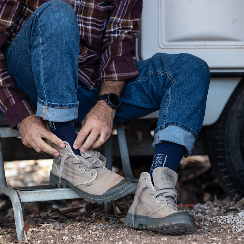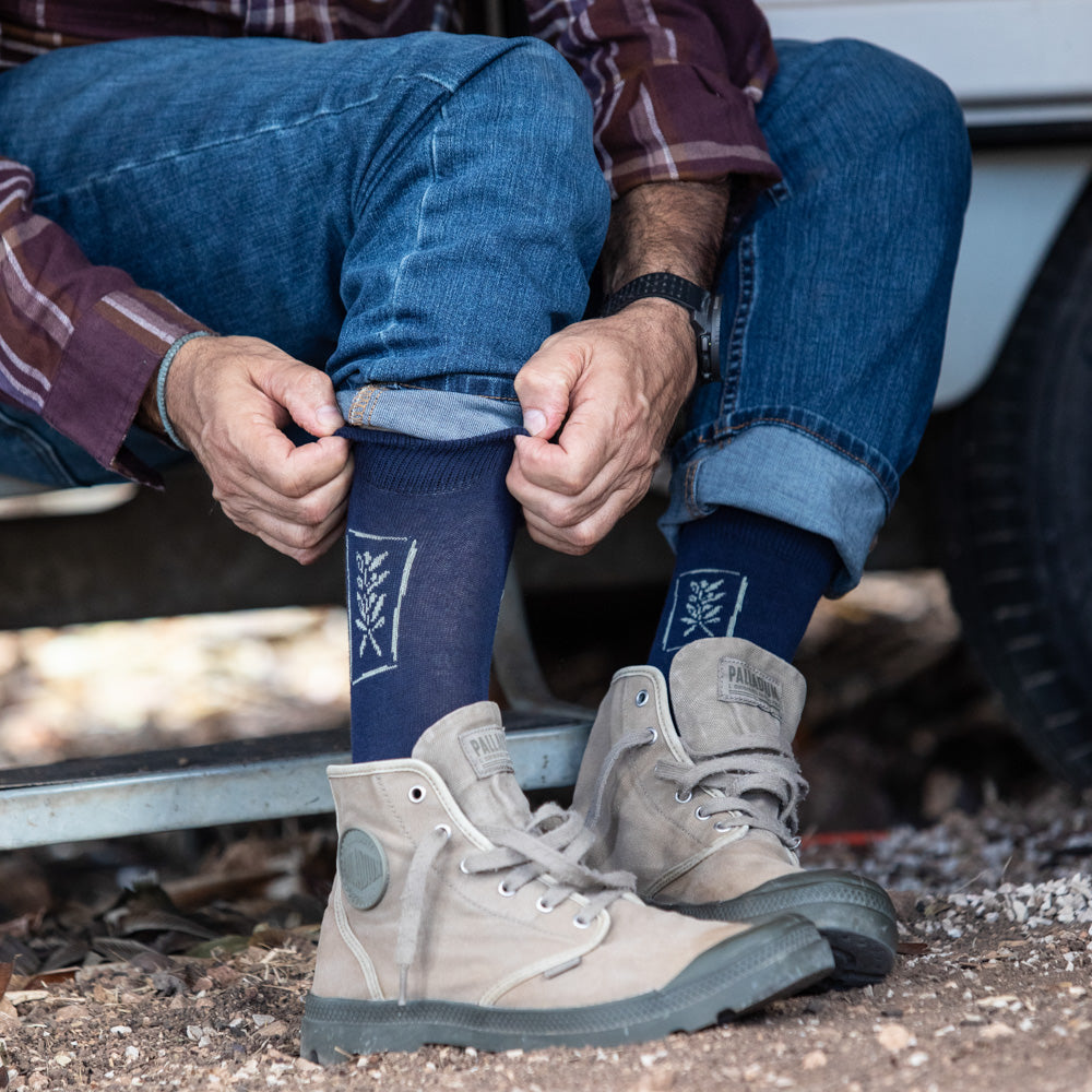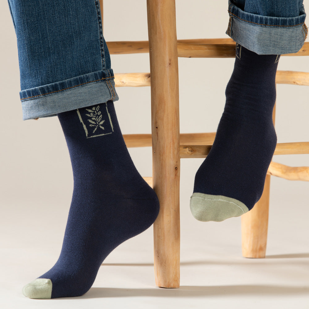 זוג גרבי כותנה נעימים בעיצוב איור ידני מתוך סדרת אצטרובל. העיצוב בהשראת טכניקת הדפס לינולאום ומציג אצטרובל וענף אורן, בהשראת עצי האורן הירוקי־עד של הגליל. האצטרובל הוא סמל לחוסן, לטבע מרפא ולשורשים עתיקים.
