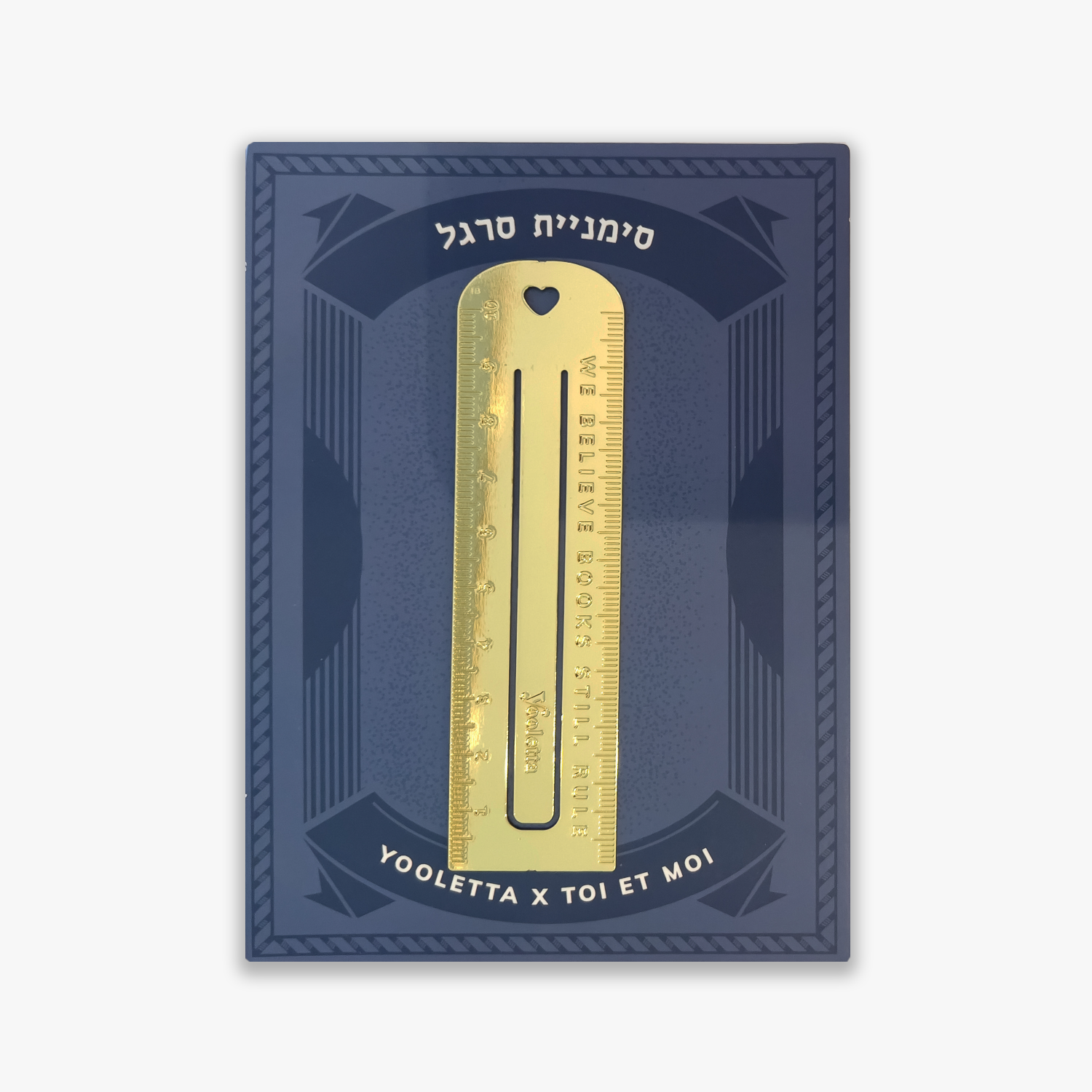 סימניית בראס מעוצבת בצורת סרגל, שיכולה לשמש גם כסרגל אמיתי במקרה הצורך, מתוך הקולקציה המקורית של Yooletta ,קולקציה שהופכת זיכרונות ילדות מקומית, פשוטה ותמימה, לאקססוריז יפהפיים שמשתלבים בחיי היומיום והופכים אותם למהנים הרבה יותר