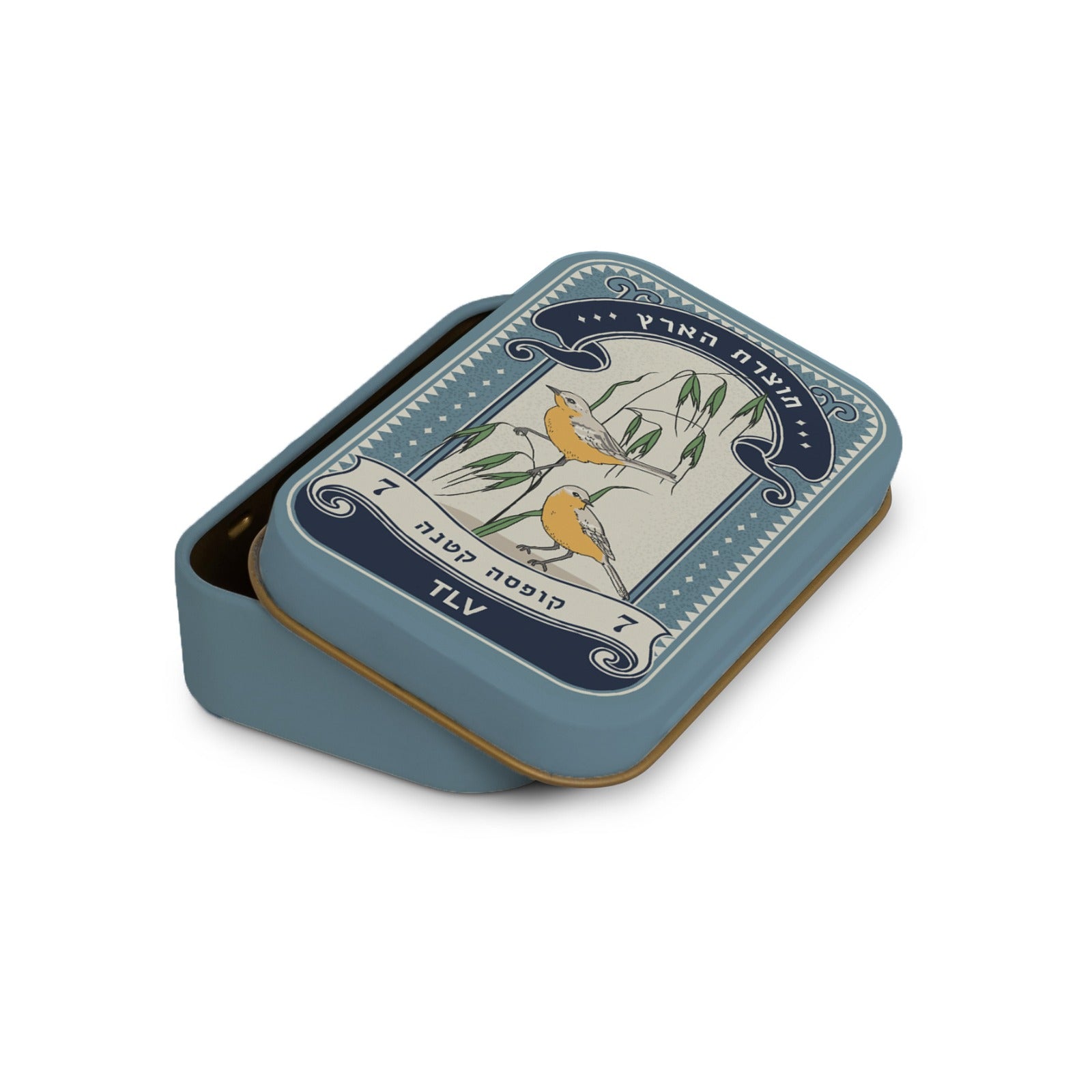 קופסת פח מעוצבת עם איורים מקוריים מתוך הקולקציה המשותפת של Yooletta וסטודיו toi et moi ההמעמידה במרכזה בעלי-חיים וצמחים ארצישראליים,
