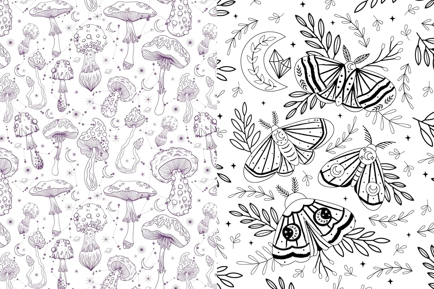 עמודי צביעה מהפנטים - גולגלות, קריסטלים פטריות ועוד, עם דוגמאות מהגאנר בגב כל עמוד.