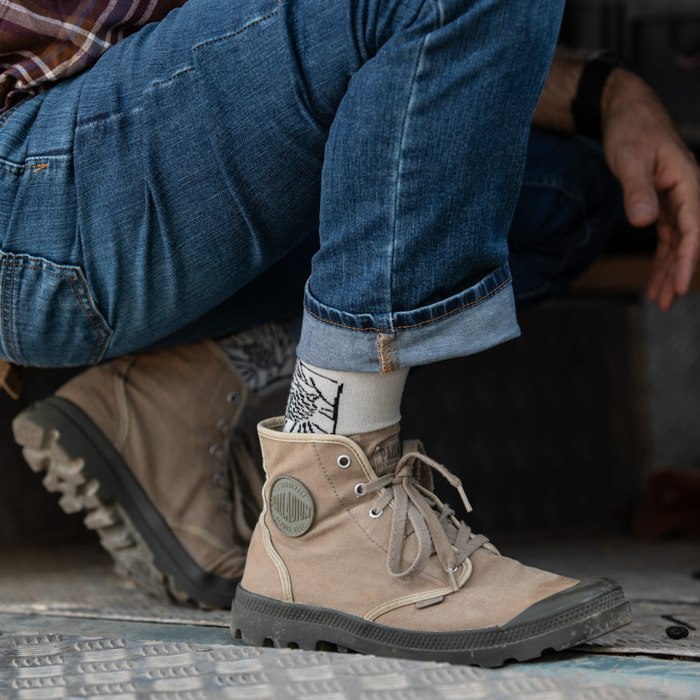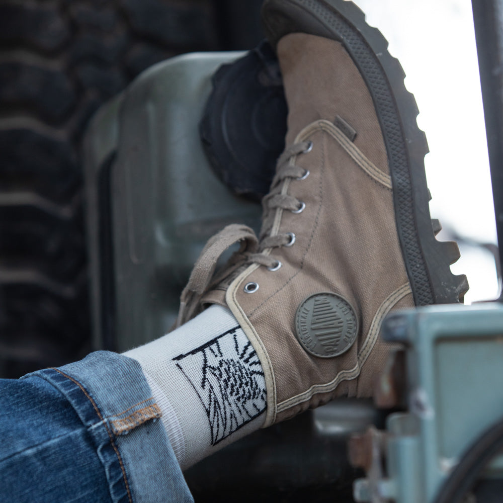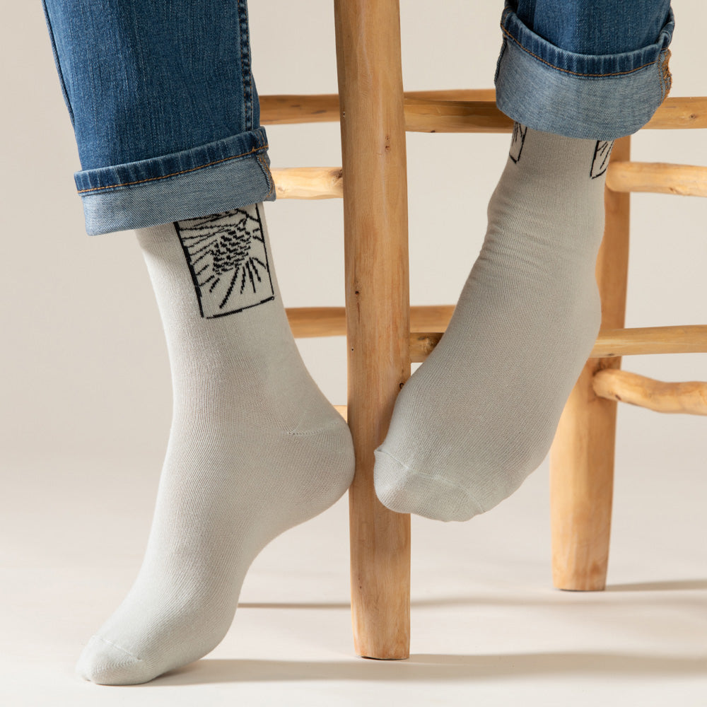 זוג גרבי כותנה נעימים בעיצוב איור ידני מתוך סדרת אצטרובל. העיצוב בהשראת טכניקת הדפס לינולאום ומציג אצטרובל וענף אורן, בהשראת עצי האורן הירוקי־עד של הגליל. האצטרובל הוא סמל לחוסן, לטבע מרפא ולשורשים עתיקים.
