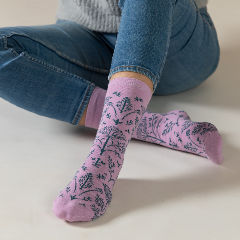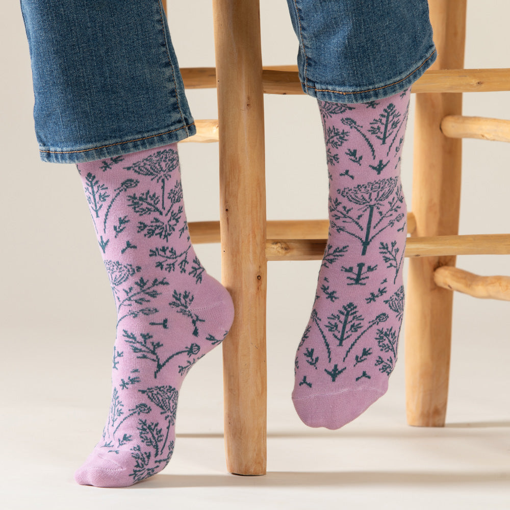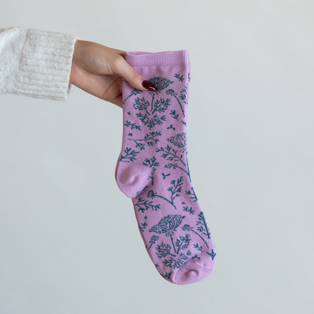 זוג גרבי כותנה נעימים בעיצוב איור ידני מתוך סדרת גזר קיפח. האיור מציג את פרח הבר הנפוץ בשולי הדרכים בגליל, שפריחתו הלבנה מזכירה תחרה עדינה המקשטת את השבילים בעדינות ופראות. גרביים בעיצוב רך ונשי בהשראת נופי הגליל וצמחיית הבר המקומית.