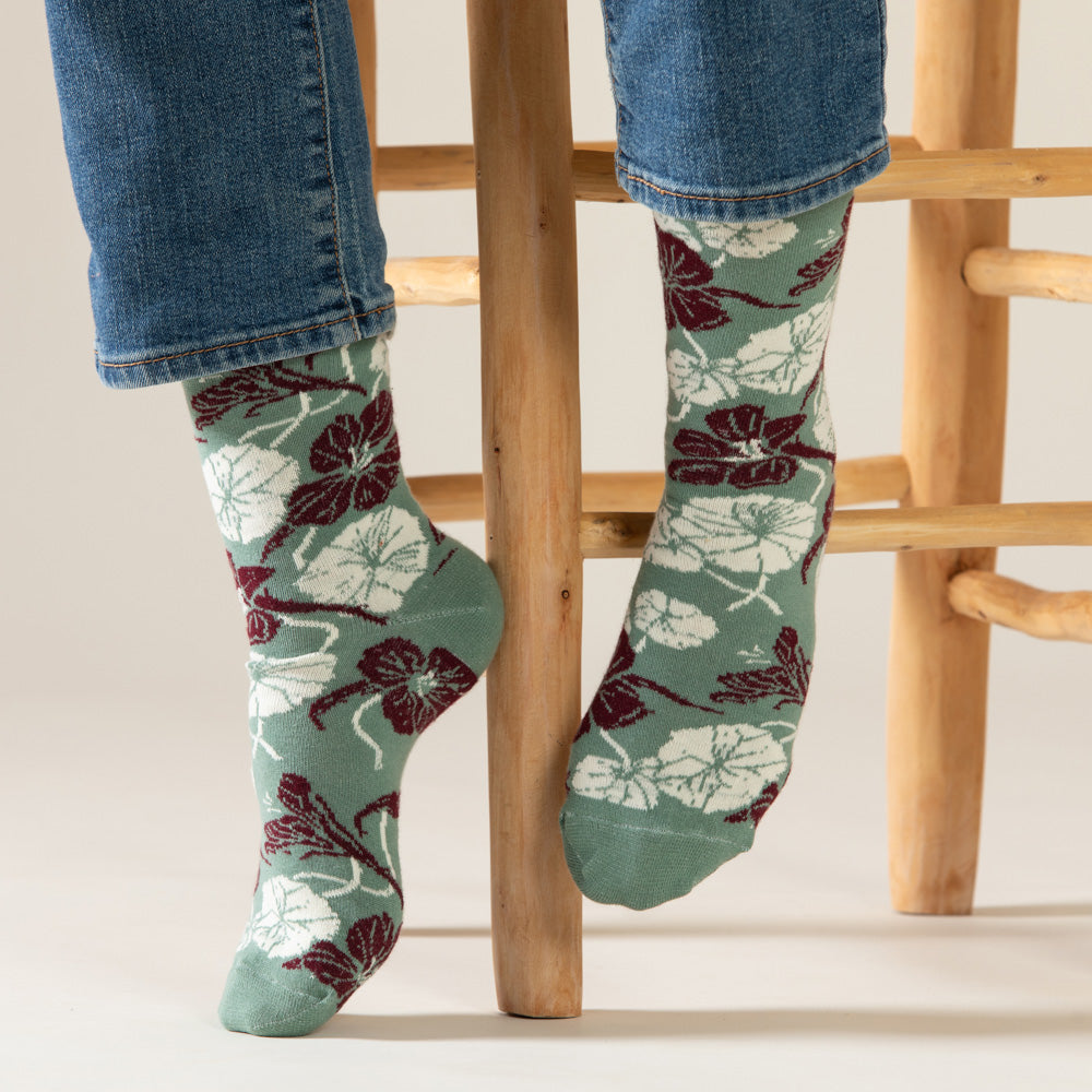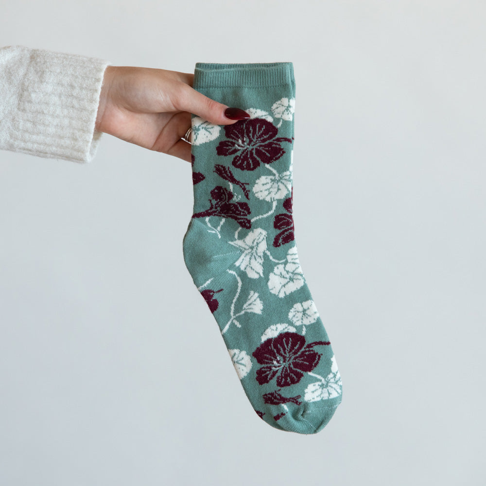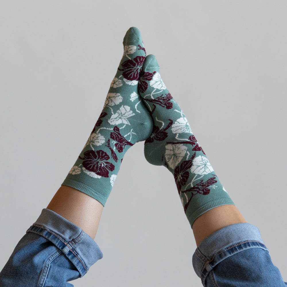 זוג גרבי כותנה נעימים בעיצוב איור ידני מתוך סדרת כובע הנזיר. האיור מתפרש על כל הגרב ומציג את הצמח כובע הנזיר בעל הפרחים הצבעוניים והמתפתלים בצורת מגבעת. גרביים בעיצוב אמנותי רך ונשי עם נגיעת טבע שקטה ונעימה.