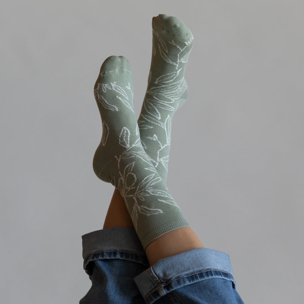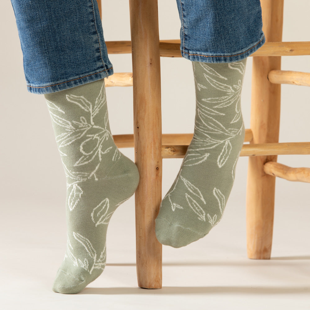 זוג גרבי כותנה נעימים בעיצוב איור ידני מתוך סדרת עלי זית. העיצוב הקווי והמינימליסטי מציג ענפי זית עדינים, בהשראת העץ הגלילי המשגשג באזור מזה אלפי שנים. ענפי הזית הם סמל עתיק לתקווה, לחיבור ולאורך רוח.